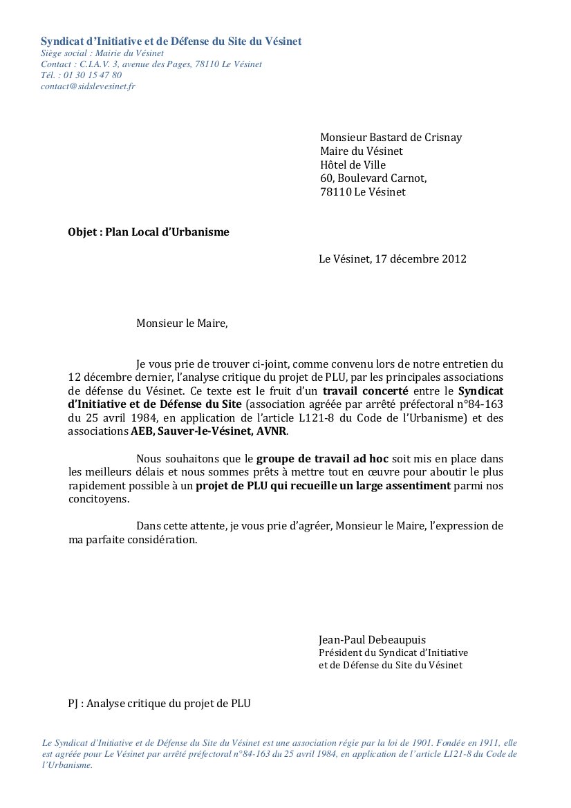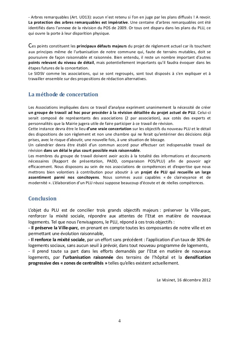 Le jeudi 6 décembre 2012, le Maire du Vésinet conviait les associations et les représentant de quartiers à une présentation de la dernière mouture du projet de PLU avant son approbation par le conseil municipal. A cette occasion, la totalité des associations, et notamment le Syndicat d’Initiative et de Défense du Site du Vésinet et les associations Sauver Le Vésinet, AEB et AVNR, partageant la même analyse, présentaient les plus vives critiques sur ce projet.