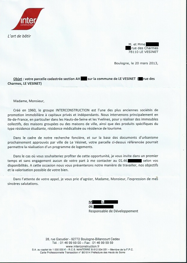 SAUVER LE VESINET a, à plusieurs reprises, mis en garde contre l’extension des zones de centralité que prévoit le projet de PLU de Monsieur Bastard de Crisnay.  C’est le cas de tout le quartier situé à l’est de la route de Sartrouville où, malgré les dénégations de la majorité municipale, les promoteurs sont déjà à l’affut. C’est aussi le cas de la rue des Charmes qui elle aussi fait l’objet d’un déclassement dans le projet de PLU voté le 24 janvier dernier.  Nous publions ci-après la lettre reçue hier par un habitant de la rues des Charmes.