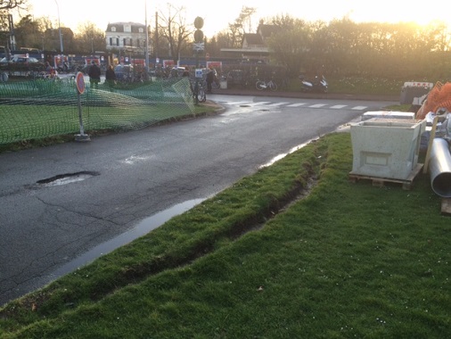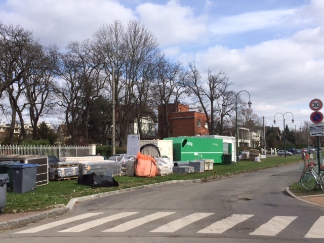 Quant aux travaux, le chantier gagne chaque jour un peu plus de terrain sur les pelouses de l’allée du Grand Veneur. On peut se demander s’il ne va pas bientôt arriver aux Ibis… Les bus gênés par l’étroitesse des voies montent sur les pelouses et les dégradent. On IMG_1402peut se demander qui va payer la remise en état de tout ceci alors qu’un peu d’organisation et de bon sens auraient permis d’installer le chantier de l’autre côté… Encore une fois, qui surveille ces travaux et que fait la Mairie du Vésinet ?