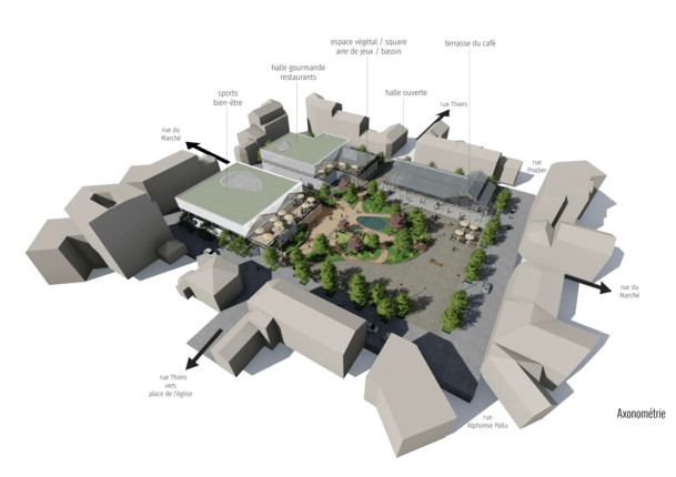 En gros, il s’agit d’utiliser le sous-sol pour  doubler les places de parking et de créer en surface trois structures : un espace « sport bien être » de 1500 à 2000 m2 sur deux niveaux, une halle « gourmande » (commerces permanents et restaurants) de 1000 à 1500 m2 (2 niveaux) et une « halle couverte » de 400 à 600m2  pour le marché proprement dit. A côté de ces trois structures le reste de la place serait traité en espace vert, aire de jeux, détente, etc. De bons dessins valant mieux qu’un long discours, vous trouverez les visuels présentés en allant sur le site de la mairie dans la rubrique« les projets de la ville » (damier à droite sur la page d’accueil). Attention, sur ces visuels contrairement à l’usage, le Nord n’est pas en haut de page, mais plutôt en bas de page ce qui ne facilite pas le repérage..
