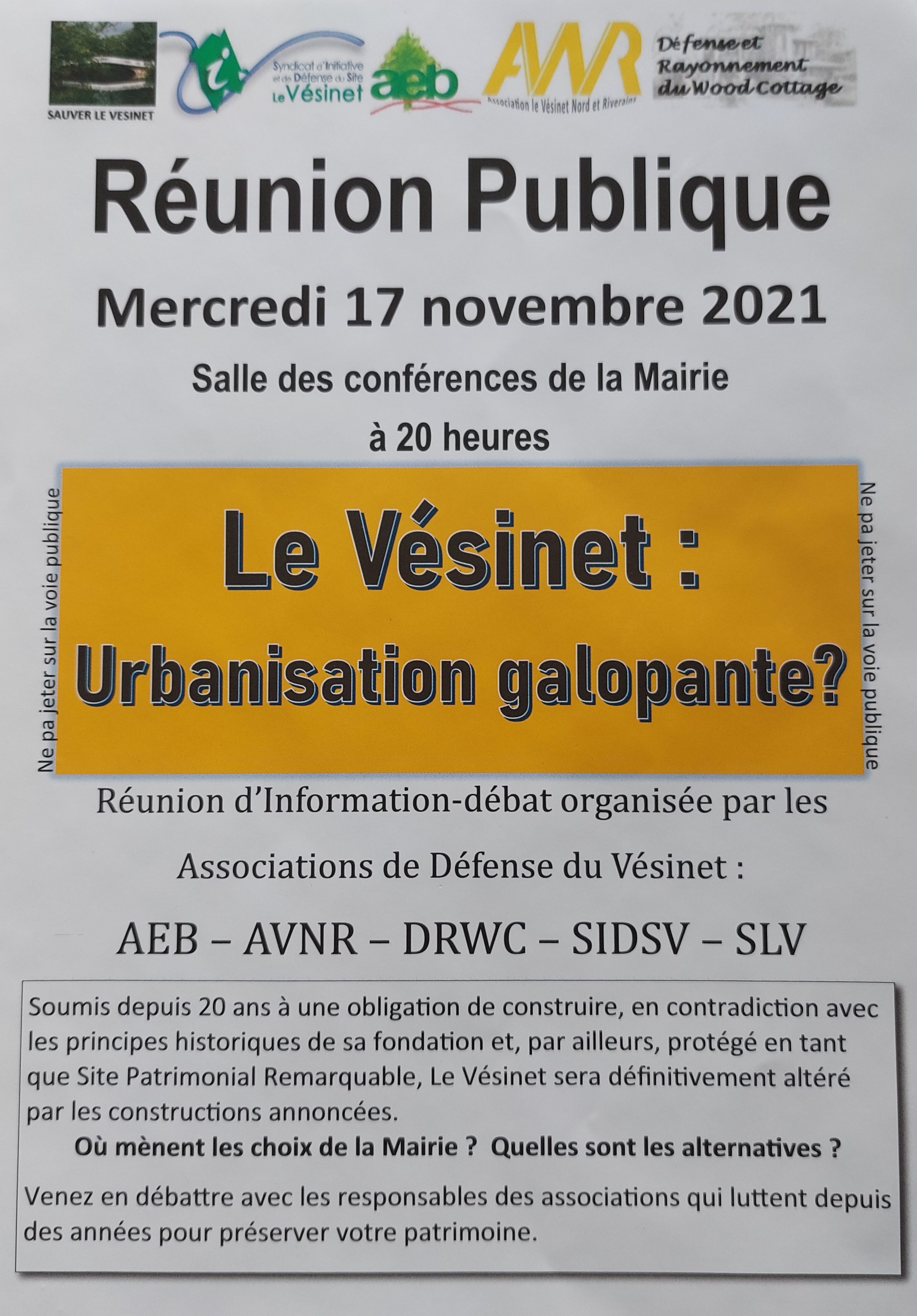 « Les habitants du Vésinet qui ont participé à la réunion publique du 17/11/2021 demandent instamment à leur Maire, Monsieur Bruno Coradetti, et à leur Députée, Madame Yaël Braun-Pivet :