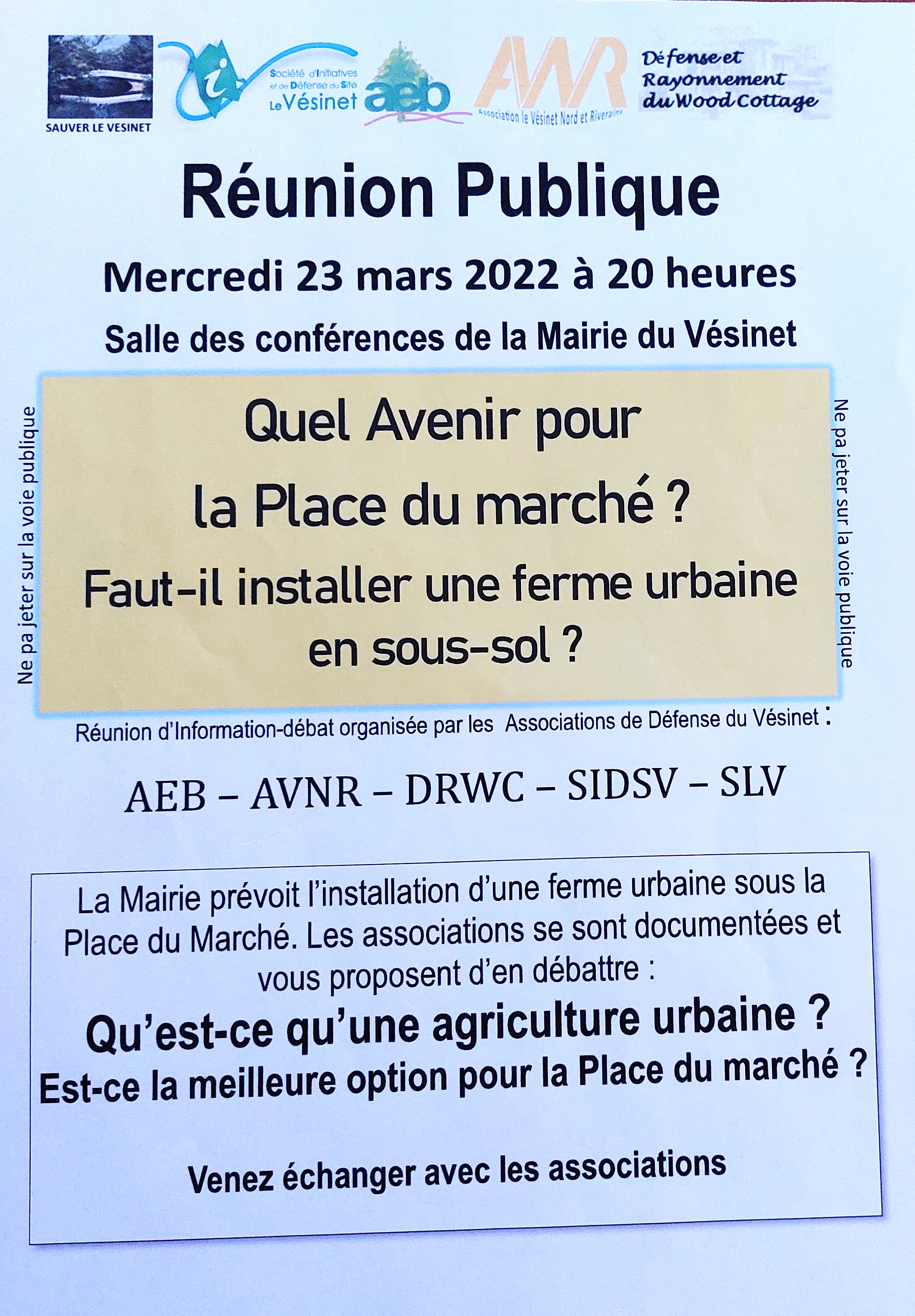 Sauver le Vésinet poursuit avec les autres associations de défense du site l’organisation de réunions d’information sur les grands enjeux du Vésinet pour les années à venir. Après celle du 17 novembre 2021 sur l’urbanisation, la prochaine réunion publique se tiendra le mercredi 23 mars à 20h dans la Salle des Conférences de la Mairie du Vésinet sur le thème : Quel avenir pour la place du marché ? Faut-il installer une ferme urbaine en sous-sol ?