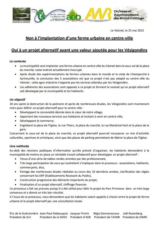 Les 5 associations de défense du site du Vésinet sont mobilisée depuis plusieurs mois sur les projets d’aménagement du centre-ville du Vésinet, en particulier l’emploi du sous-sol de la place du marché.