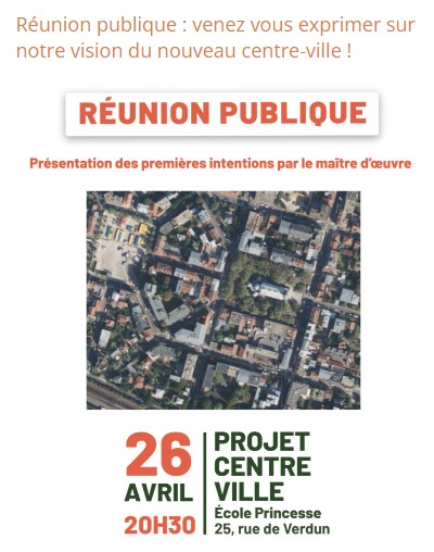 La Mairie organise une réunion publique à l’école Princesse le 26 avril 2024 – 20h30, en présence du Maître d’œuvre, l’Agence TER, pour présenter les premières intentions d’aménagement sur les cinq zones : rue du Maréchal Foch, place de l’Eglise, rue Thiers, Place du marché et place de la gare (RER).