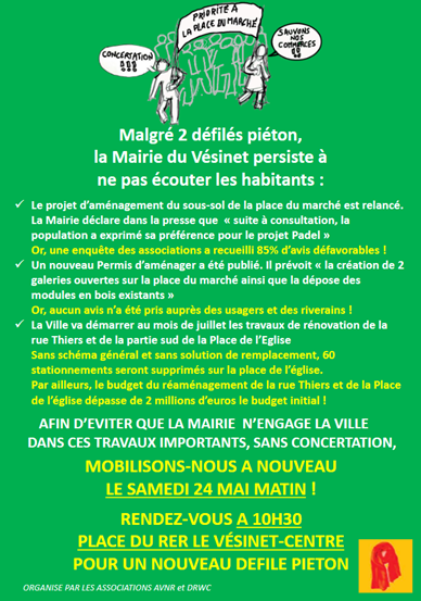 Dans cette logique, venez nombreux au nouveau défilé piétons organisé par AVNR qui aura lieu le samedi 24 mai à partir de 10h30 (rendez-vous place de la gare RER Vésinet centre – cf flyer ci-joint)